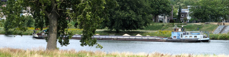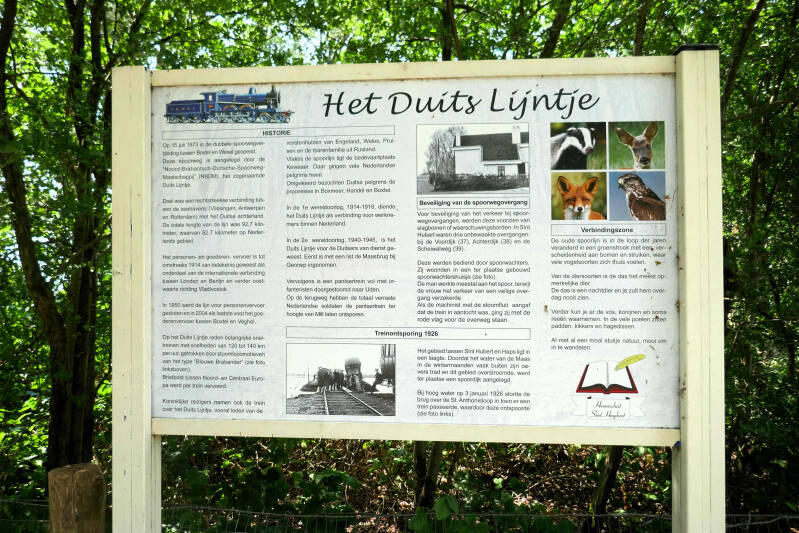Aan de overzijde van de Maas ligt het Land van Cuijk, het doel van onze fietstocht van vandaag. Een rondrit van ongeveer 43 km en grotendeels door Brabant. Het eerste stukje van de route ligt nog in Limburg en daar stuiten we direct een probleem. Het fietspad naar de brug over de Maas is afgesloten en er wordt geen omleiding aangegeven. De werklui wijzen ons een route die ons uiteindelijk wel bij de brug doet uitkomen, maar pas nadat er een paar kilometer extra zijn afgelegd waarbij we bovendien met de fiets een steile helling op moeten klauteren. Maar nadat dit leed is geleden volgt een leuke tocht door een mooie omgeving. Halverwege stuiten we op een bord dat het tracé van het z.g. Duits Lijntje aangeeft, een voormalige spoorwegverbinding waar een aardig verhaal aan vastzit.