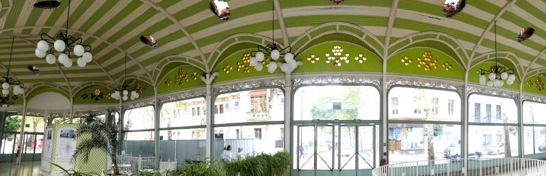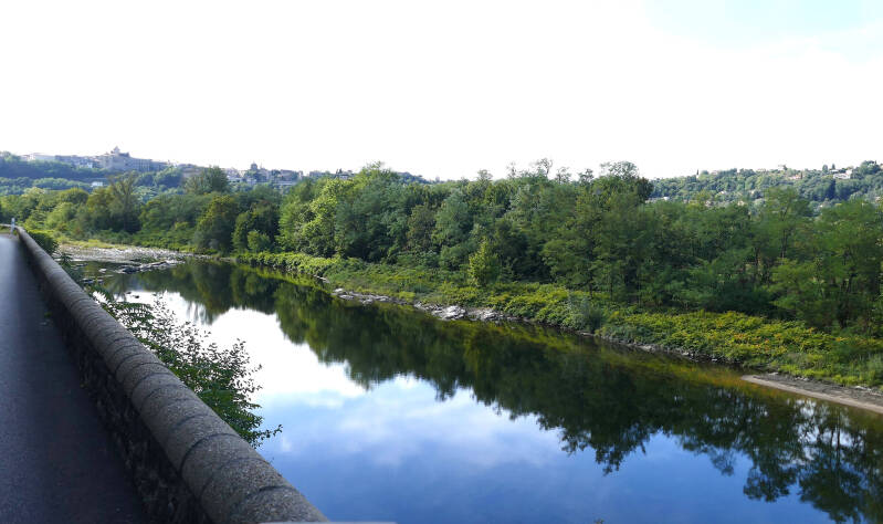 Onze camping ligt in het plaatsje Bellerive sur Allier met Vichy aan de overzijde van de rivier. Via de boulevard langs de rivier is het ongeveer twee kilometers tot aan de burg over de Allier, waarbij je over de brug direct in het centrum van Vichy bent. In Vichy lopen we eerst door het Parc Napoleon naar het VVV. De naam dankt het park aan Napoleon I die hier een zevental grote villa’s heeft laten bouwen. De grootste voor hemzelf en de overigen voor zijn entourage. Bij het VVV aangekomen blijkt dat we tien minuten te laat zijn. De Fransen houden van een lange middagpauze en nemen geen genoegen met een paar meegebrachte boterhammen. Men heeft gelukkig de standaard met folders buiten gezet, zodat we ons zelf kunnen bedienen en op eigen kracht verder kunnen gaan. Pal tegenover het VVV ligt het Parc des Sources, eveneens in opdracht van Napoleon gerealiseerd. Vichy maakt indruk met grote monumentale gebouwen, maar nu wij er zijn worden volop renovatie werkzaamheden uitgevoerd en is het een lawaai vanjewelste. Wij vluchten voor de herrie het gebouw van de warmwaterbronnen in. Hier kun je over een rand naar de bron gluren waar water van 43,5 graden uitkomt. Ook mag je water tappen in een flesje en zo de heilzame drank mee naar huis nemen. Wij vervolgen onze wandeling en komen onder meer langs het imposante stadhuis, een kerk en verschillende andere parken. Opvallend is het levendige straatbeeld met talloze eetgelegenheden die ook op maandagmiddag al volop klandizie hebben. In het hoogseizoen zal het helemaal gezellig druk zijn, maar nu overheerst op een flink aantal plekken de overlast van de werkzaamheden. Wij vinden het inmiddels wel goed zo en wandelen terug in de richting van onze camping.