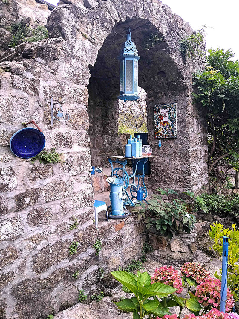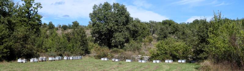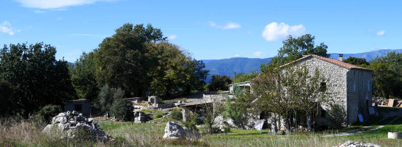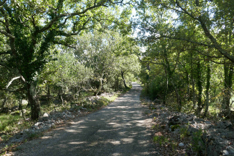 Nu Aukjes knie het tijdens de klimoefening van eergisteren goed gehouden heeft, willen we er vandaag nog een schepje bovenop doen. Weer omhoog en omlaag dus en vandaag met als doel de hermitage die verderop op een helling moet zijn gebouwd. We steken opnieuw de beek Le Sandron over en slaan verderop nu linksaf een track in dat verder omhoog gaat. Een mooie wandeling volgt, waarbij we door een bosrijke omgeving lopen. Bij de hermitage aangekomen zien we dat graaf Raymond d’Ucel geen half werk heeft afgeleverd. Hij zou de kapel in de dertiende eeuw hebben gebouwd op het graf van zijn vrouw Blance, die bij een aanval op het kasteel van Ucel om het leven was gekomen. Rondom de kapel zien we tekenen van bewoning, zoals een kleine moestuin en hout voor de open haard. En vanuit de kapel menen we ook geluid te horen vanuit een ruimte achter de kapel. We laten de eventuele kluizenaar(ster) verder met rust en vervolgen onze wandeling. Die route gaat daarbij verder omhoog totdat we op een track uitkomen. Hier buigen we rechtsaf en via nog wat doorsteekjes, waarbij het af en toe wat klauteren is, komen we terug bij de camping. Volgens onze telefoon een wandeling van 4,75 kilometers met daarbij 160 meters stijgen en dalen.
