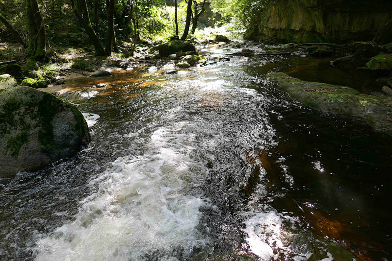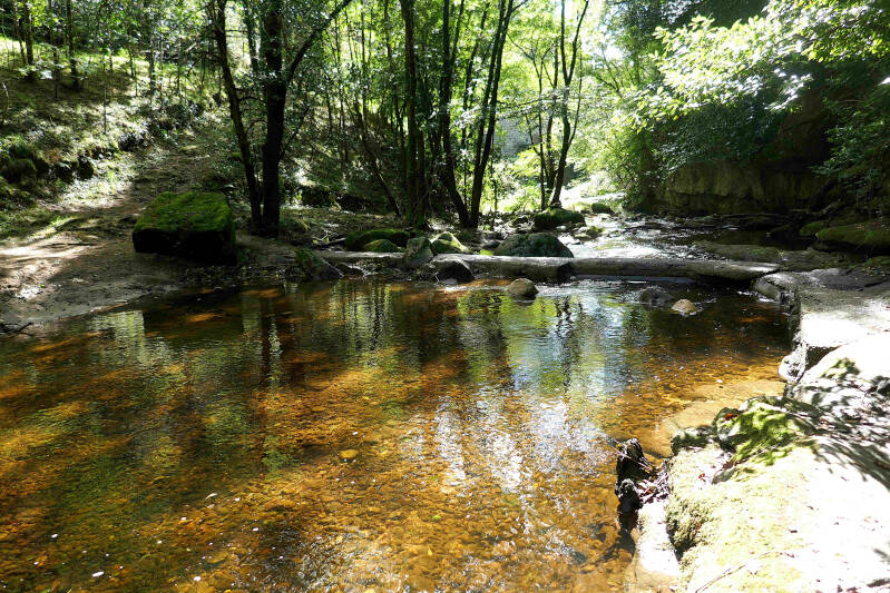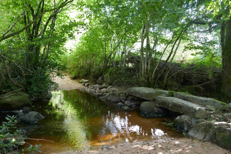 Tot nu toe hebben we vooral over vlakke paden gewandeld, maar hier in de omgeving is er volop gelegenheid om te testen hoe Aukjes knie het houdt als er pittig geklommen en gedaald moet worden. Vandaag zou het bewolkt zijn maar droog blijven, dus deze kans willen we benutten. De route gaat eerst steil omlaag naar het riviertje Le Sandron, over een primitief stenen bruggetje en vervolgens weer steil omhoog. We worden daarbij begeleid door een hond die ons volgt.
