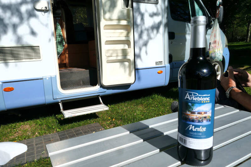 Na zes nachten op de overigens prima camping van Ucel (goede douche en uitstekende gratis WIFI)hebben we het hier wel gezien. Tijd om een volgend stekje te zoeken. Volgens onze Campercontact gegevens is op ongeveer dertig kilometers afstand een goede camping die bovendien nog geopend is. En dat is in dit jaargetijde lang niet vanzelfsprekend, want het merendeel van de campings houdt het ergens in september voor gezien. Op weg naar camping Arleblanc nabij Rosières, stoppen we bij de Leclerc Hypermarkt in Saint-Etienne-de-Fontbelllon. Daar kunnen we zowel boodschappen doen als onze koffiepauze houden. Daarna rijden we door naar de camping. We mogen een plek uitzoeken op een groot grasveld, waar nauwelijks sprake is van privacy. Daar weet Aukje wel wat op. Ze kiest voor een plek helemaal aan de rand van het veld. Wel een eind lopen naar het sanitair en er is ook een erg lang snoer naar de stroomaansluiting nodig, maar met vrij uitzicht en dat is ook wat waard.
