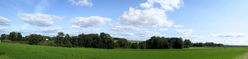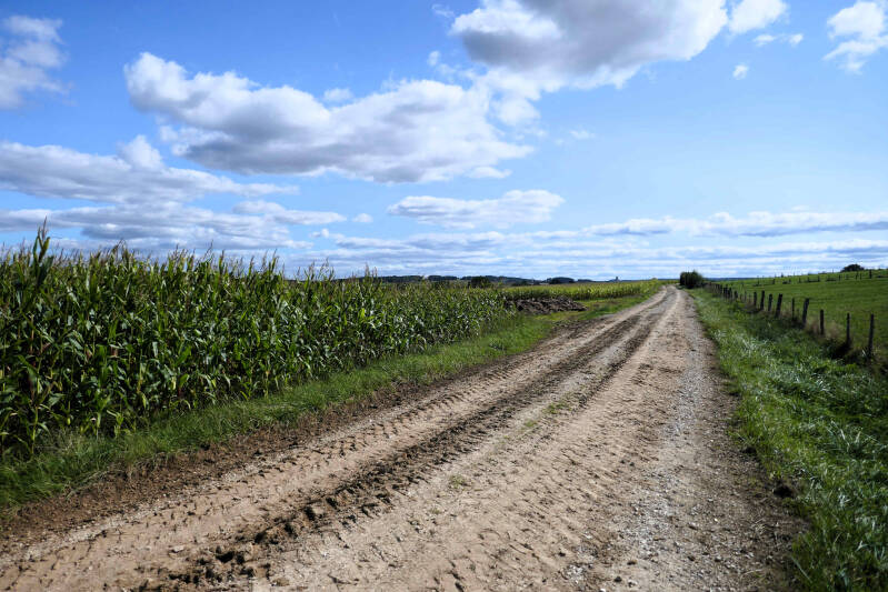 Zaterdag gaan we opnieuw op pad. Volgens de campinghouder kunnen we door het boerenland een rondwandeling maken, maar deze staat niet goed op de kaart aangegeven. We lopen door het dorp naar het zuiden en volgen een landweg die verderop in een karrenspoor overgaat. Gelukkig is het de laatste dagen droog geweest want de ondergrond is van vette klei en zou met regen onbegaanbaar zijn. Aan het einde van het track moeten we een stuk dwars door het boerenland om verderop bij een bruggetje over de beek uit te komen. Vanaf daar volgen we een pad dat ons op een asfaltweg brengt. Na in totaal ruim zes kilometers zijn we weer terug op de camping. Tevreden stellen we vast dat Aukjes nieuwe knie het, met deze voor haar record afstand, prima gehouden heeft. Even afwachten of ze er morgen nog zo over denkt.
