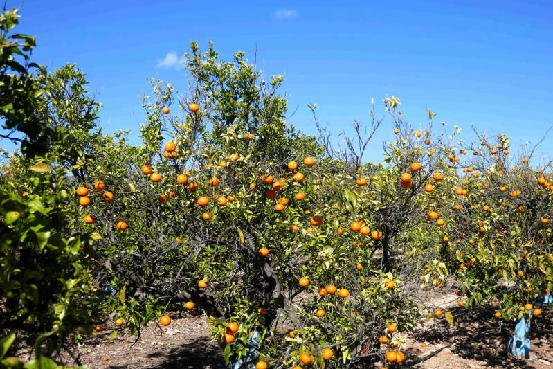 Vandaag willen we een fietstocht in de omgeving maken. Langs de kust is het hier goed fietsen, met zowel z.g. Via Verdes (voormalige spoorlijnen) als lokale binnenwegen. Zuidelijk van Ribera de Cabanas begint het stadje Oropesa en als we die richting uitgaan moeten we eerst een kleine acht kilometers door de stadsbebouwing fietsen. Vandaar dat onze route vandaag naar het noorden gaat. Na ongeveer twee kilometers over het fietspad zie ik een rustige binnenweg waarvan mijn telefoon aangeeft dat die voorlopig niet dood loopt. We peddelen vervolgens langs velden met vooral mandarijnen, maar gezien de grootte ervan en de hoeveelheid die onder de bomen op de grond ligt, zullen die niet meer worden geoogst. Een proef op de som leert dat de mandarijnen de afgelopen tijd onvoldoende water hebben gekregen. Onze tocht vervolgend zie ik dat we richting het stadje Torre Blanca rijden, dat gezien de afstand ons doel voor vandaag gaat worden. In het centrum van het stadje blijken ook rond twee uur nog enkele eetgelegenheden open, zodat we even later aan een lekker koud pilsje zitten. Ook de hamburger die we bestellen blijkt van topkwaliteit, zodat we met gevulde magen de thuisreis kunnen aanvangen. Al met al een geslaagde dagbesteding vandaag.