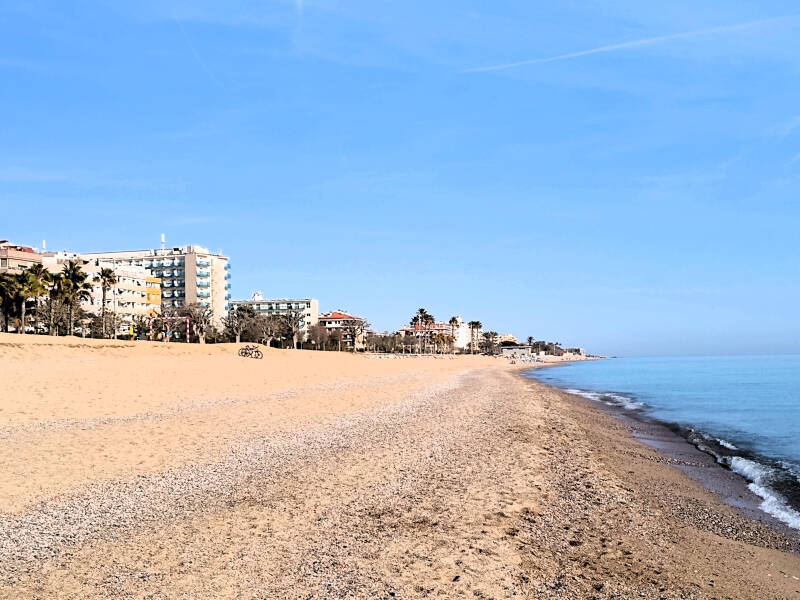 Toen halverwege de jaren zestig van de vorige eeuw het massatoerisme op gang kwam, werd het gebied ten noorden van Barcelona -waar we nu zijn- het eerste doelwit. Per vliegtuig via Gerona of met de pendelbus, waar bij je al dan niet ‘s nachts een oogje kon dicht doen, werd een mensenmenigte vanuit Noord West Europa naar de Spaanse zon getransporteerd. De vissersdorpjes in deze regio werden in no time omgetoverd tot toeristenbestemmingen, waarvoor natuurlijk behalve het strand ook in de avond het nodige moest worden georganiseerd. Zo werd Lloret de Mar een ware hotspot en in navolging veranderden ook de in de omgeving gelegen plaatsjes, waaronder Callela en Pineda de Mar. Weer wat later kwamen ook andere regio’s langs de Spaanse kust aan de beurt, zoals Benidorm, Alicante en weer later Malaga en Torremolinos. In de tachtiger jaren heb ik me ook een aan zo’n ‘avontuur’ gewaagd: een busreis naar Callela met stopover in het Franse Beaune. Nu ik weer wat van de griep ben opgeknapt ga ik zaterdagmiddag te voet naar Callella om te zien wat ik me er na zo’n vijfenveertig jaar nog van herinner. Lopend langs de boulevard ziet het er redelijk goed onderhouden uit.