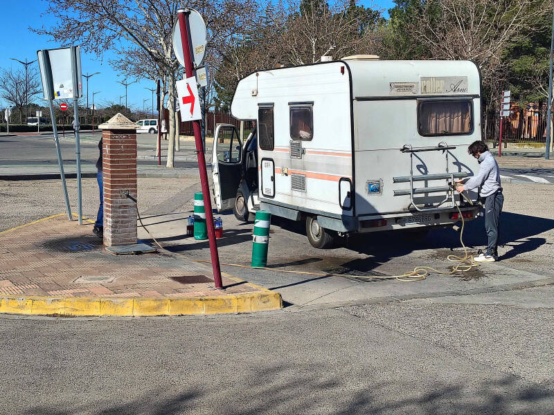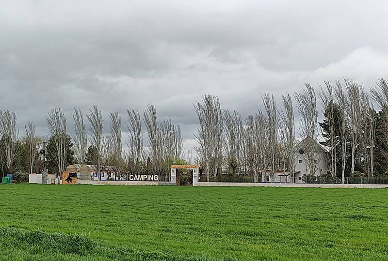Omdat het ondermaatse weer in hele regio hier nog enkele dagen zal aanhouden heeft het niet veel nut om naar een andere plaats te verhuizen. Een dag om binnen te blijven, want het is met tien graden overdag niet alleen koud. Het waait flink en de gehele dag komen er buien over terwijl de ook de zon het laat afweten. Dus alle gelegenheid om het maar eens over de camping hier te hebben. Camping Los Arenaless is royaal opgezet met grote percelen en rondom bomen en struiken. Wat betreft de faciliteiten is er, net als bij bijna alle campings in het binnenland, wel het een en ander aan te merken. Zo is de afvoer voor chemisch toilet en grijs water uitgevoerd met een luikje in de grond. De regendouche is heerlijk warm, maar sputtert en maakt daarbij een kabaal alsof er constant lucht in de leidingen zit. Toevallig wordt dezer dagen een toegangsdeur plus kozijn van het toiletgebouw vervangen. Kennelijk is een juiste maat hiervan niet voorhanden en wordt er nu een deur die ca. 10 centimeter te breed is gebruikt. Om deze passend te maken wordt een stuk uit de muur gehakt waarna het geheel weer wordt aangesmeerd.