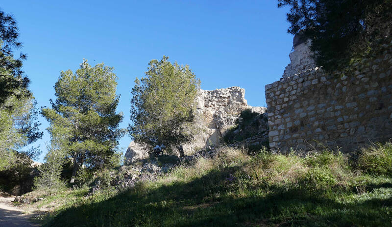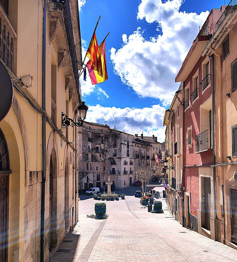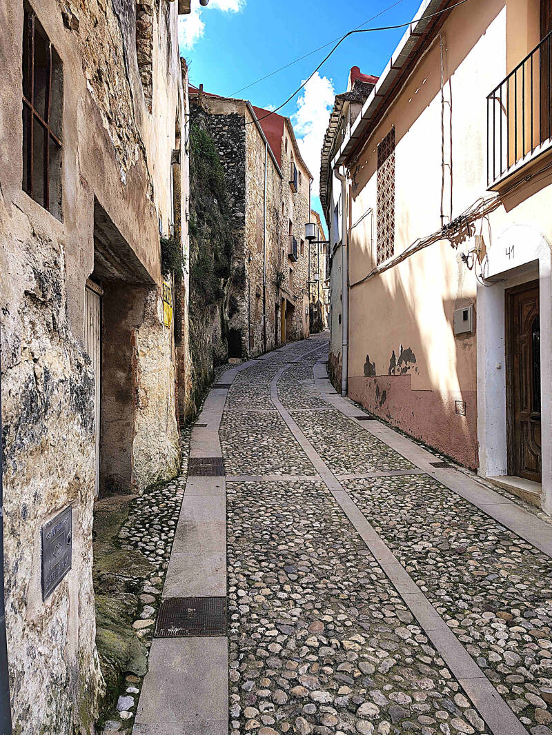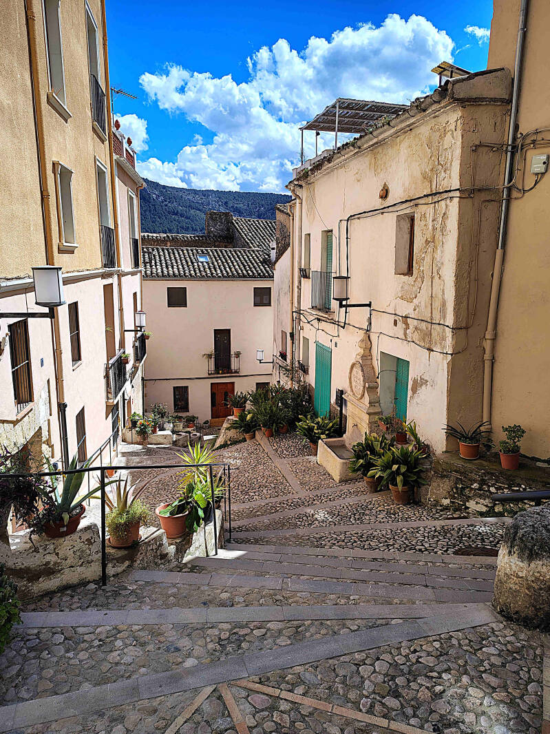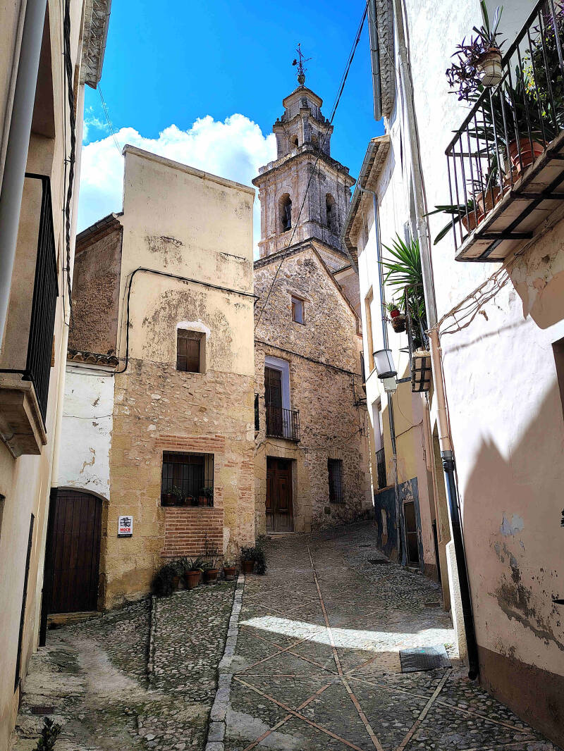 Ook vanmorgen is het stralend weer, op 680 meter hoogte niet warm, maar windstil en door de zon best aangenaam zodat we buiten zouden kunnen ontbijten. Wat een verschil met maar een paar dagen geleden. Bocairent bestaat uit een oud gedeelte dat in lagen boven elkaar langs de rivier tegen een helling is gebouwd en verderop een nieuw gedeelte. Onze aandacht gaat uit naar het oude deel en er zijn twee routes om er naar toe te gaan. We kiezen op de heenweg voor de toeristische route die ons via een smal weggetje het dal in voert. Aan de andere zijde van de rivier moeten we weer omhoog en dat gaat almaar door totdat we helemaal boven in het dorp uitkomen. Hier zijn de straatjes zó smal dat je er alleen met vergunning met de auto mag komen. Door verschillende steegjes komen we uiteindelijk uit op het Plaza de San Vincent waar we even pauzeren. Het plein was vroeger de plaats van het gemeentehuis met daaronder de gevangenis. Via de kerk en het plein, met daarop onder meer het huidige gemeentehuis, lopen we richting het nieuwe gedeelte van Bocairent en vandaar over een brede weg en de Via Verde (voormalige spoorlijn) terug naar de camping. Net als gisteren kunnen we ook vandaag kunnen we weer buiten eten.