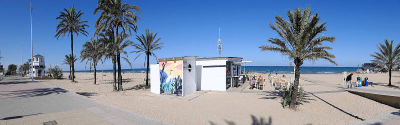 Daarna rijden we afwisselend over een goed berijdbare tweebaansweg en de A7 snelweg totdat we bij Gandia komen. De stad Gandia ligt op enkele kilometers van zee en ons doel vandaag is Platja de Gandia dat, samen met de havenplaats El Grau, wel aan zee ligt. Zodra we in Platja de Gandia arriveren zoeken we eerst de Carrefour Market op voor het inslaan van de boodschappen, daarna rijden we een paar honderd meter verder tot bij een wasserette. We kunnen gelukkig voor de deur van de wasserette parkeren, zodat we koffie kunnen drinken terwijl we vanuit de camper de was in de gaten kunnen houden. Nadat de was weer droog in de camper ligt rijden we de laatste twee kilometers tot aan de camping. Op camping La Naranja kunnen we uit verschillende plekken kiezen, maar eerst moeten we zowel de toiletcassette als de grijswatertank legen. Die mochten we op de vorige camping niet legen omdat het een natuurcamping was zonder aansluiting op de riolering. Rond vijf uur staan we geïnstalleerd op een aardig plekje en kunnen we buiten tevreden van een pilsje genieten.